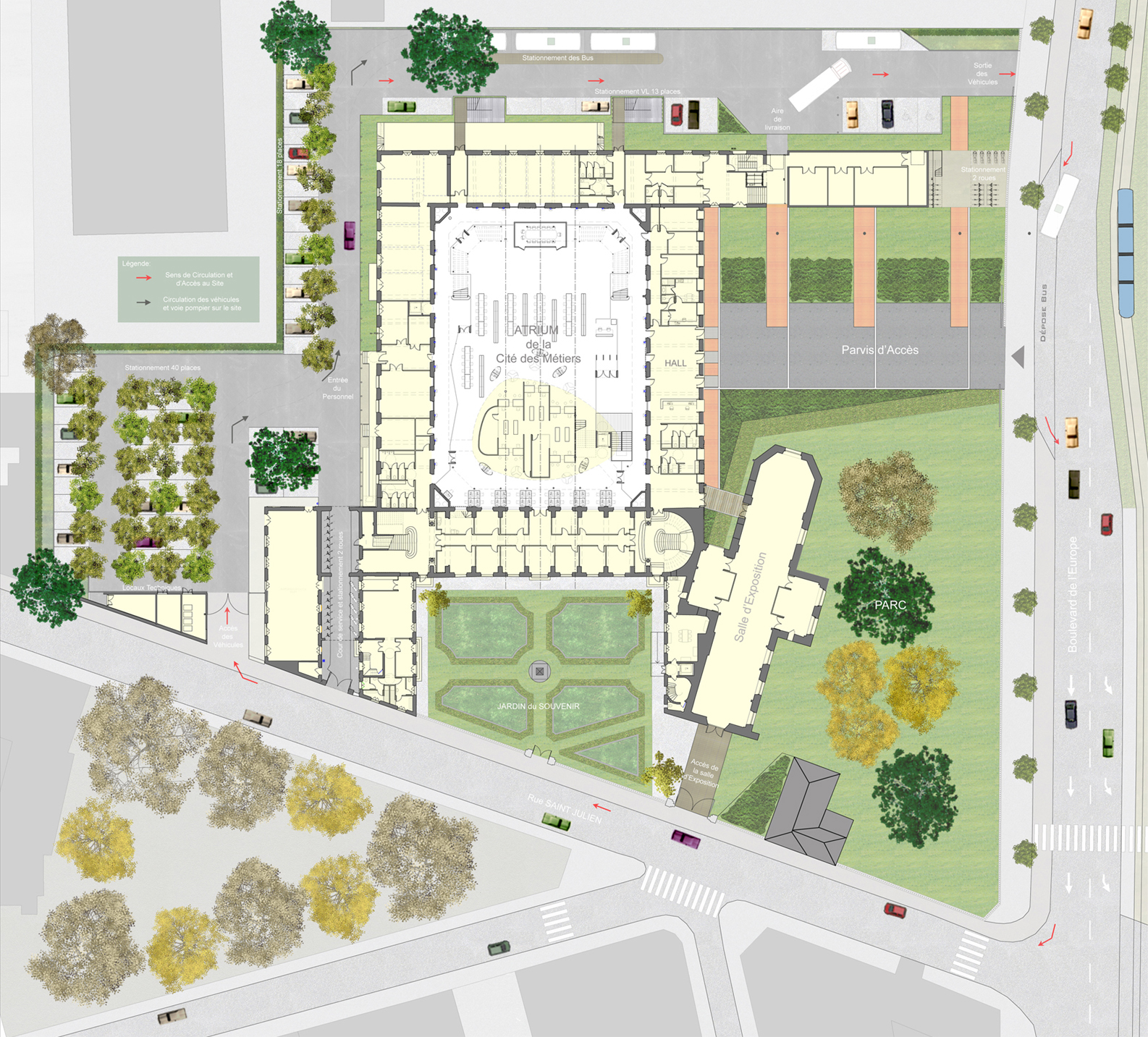 Le projet s’appuie sur l’ordonnancement axial hiérarchique originel pour créer les conditions d’une nouvelle centralité et organiser les programmes ;la Cité des Métiers, l’Amphithéâtre et les services partagés et les Associations.En réponse précise aux exigences fonctionnelles, la superposition de l’amphithéâtre dans son enveloppe rouge comme en sustentation au-dessus de la scénographie en plateau de la Cité des Métiers donne au cœur de l’Atrium une présence vivifiante et à la lisibilité parfaitement maîtrisée. La transformation des façades intérieures de l’Atrium en arcatures, par suppression des châssis et de leurs allèges, contribue à affirmer cette centralité ; les coursives ne longent plus seulement les ailes, elles en sont le prolongement vers l’Atrium.